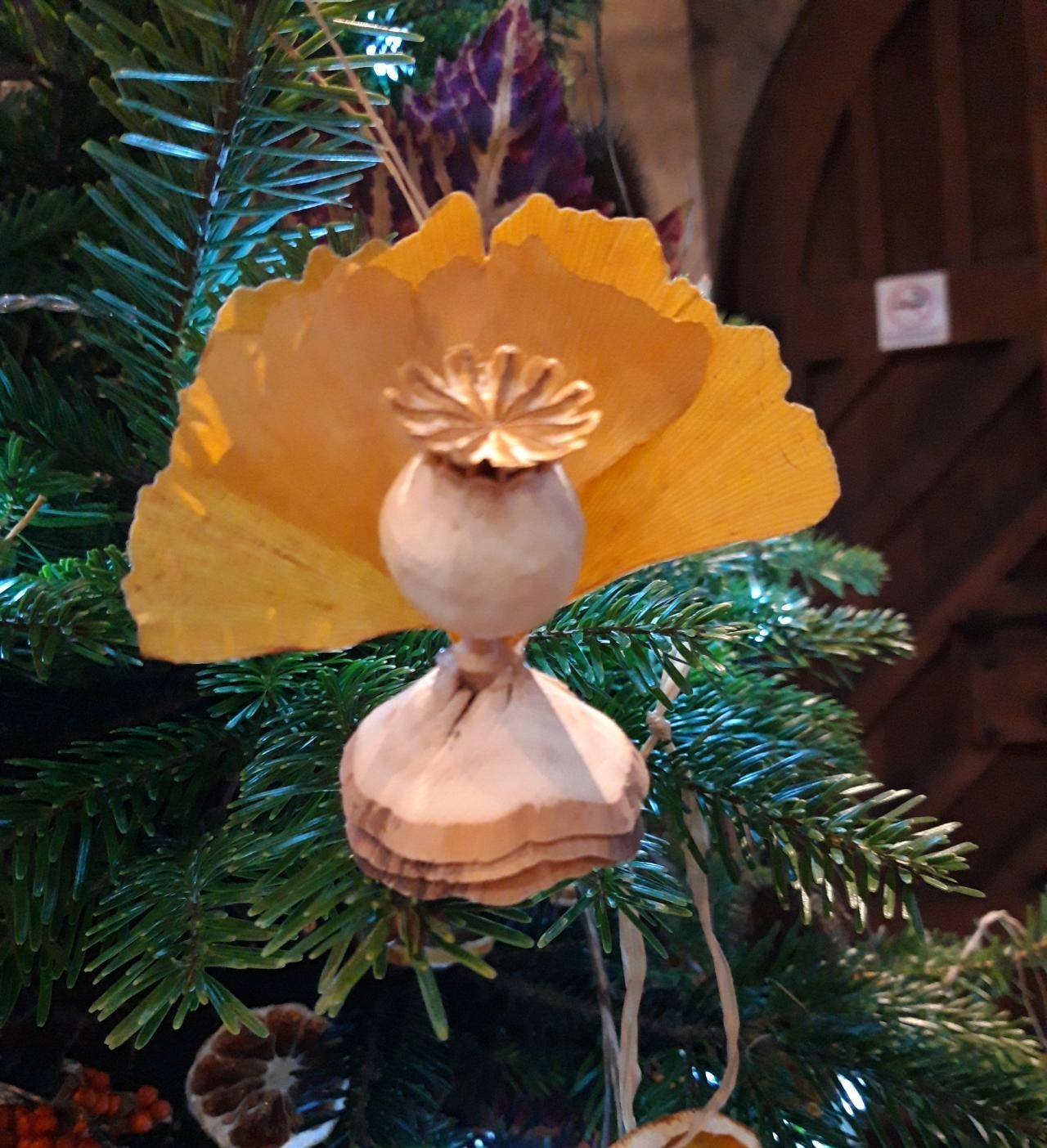 Christmas Tree decoration of Ginko Angel with ginko leaf wings, poppyseed and wood shaving skirt detail for ‘Nature’s Bounty’ Sustainability Tree 2 to 4 December 2022